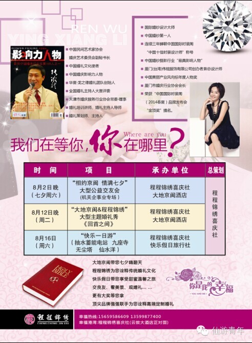 为弘扬中华传统爱情文化,大力倡导文明时尚、积极向上的婚恋新风,进一步拓宽我县适龄青年的沟通交流渠道,帮助广大单身男女寻觅爱情,创造美好生活,仙游团县委、县妇联和仙游今报举办仙游首届青年婚礼文化节之“相约京闽·情满七夕”大型公益交友会(机关企事业单位专场),希望通过激情飞扬的舞台氛围,精彩纷呈的互动活动,浪漫迷人的集体约会,让广大俊朗秀女从高楼大厦走出来,从单一和封闭的生活圈中走出来,在热情似火的夏天,感受一份惬意,邂逅一份浪漫,收获一份爱情。