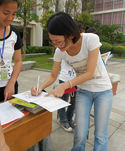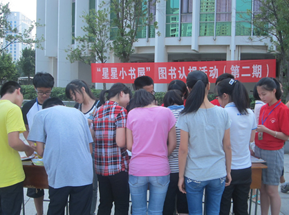 日前,莆田四中“星星小书屋”图书认捐活动(第二期)在校图书馆门前举行,活动现场学生们非常热情,围着图书翻看起来,认真地签上名,把钱款投入红箱子,还有很多教师带着自己的孩子一起过来认捐,截止当天下午6:40,200本精美绘本,被认捐一空。近日,校团委志愿者将200本图书送往坪洋小学。朱校长热情接待了我们的志愿者,并代表学校、代表深山里的孩子对我们的无私捐赠表示感谢。
