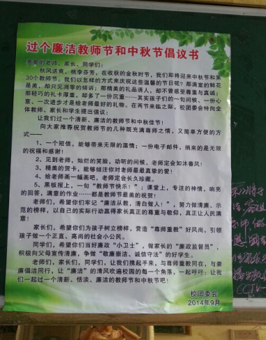 | 2014年中秋节、教师节、国庆节将至,为深入贯彻落实中央“八项规定”和省、市、区纪委有关加强节日期间党风廉政建设的工作要求,中山中学正确引领全体教职工过一个欢乐祥和、风清气正的节日,特在全体教师中发出倡议。 倡议以短信、致家长一封信、电子屏公告等方式提醒,请老师们牢记“廉洁从教,清白做人”。要求老师们自觉抵制收受学生及家长礼品礼金等不正之风,大力倡导文明健康的尊师重教理念,营造风清气正的育人环境。倡导老师们以自己的实际行动赢得家长真正的尊重与敬仰! 中山中学一贯重视在职教师的廉政从教教育,开学初就签订师德责任状、师德承诺,填写校外辅导情况,此次倡议更是把廉政从教教育落到实处。(何亚飞)