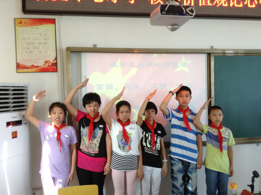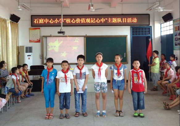 | 为促使队员们对社会主义核心价值观有更深刻的理解,促进他们积极践行社会主义核心价值观,肩负起实现中国梦的使命,石庭中心小学开展了“践行社会主义核心价值观”系列活动(共计1333名队员参加),推进了小学生核心价值观教育纵深发展。 本次活动在深入研究的基础上,充分利用红领巾广播站、公共宣传栏及国旗下讲话等多种途径,让“富强、民主、文明、和谐,自由、平等、公正、法治,爱国、敬业、诚信、友善”的 24 字“社会主义核心价值观”基本内容和习近平总书记对少先队员提出的“记住要求、心有榜样、从小做起、接受帮助”16字要求,熟知于全体师生心中。 活动期间,各中队相继组织开展围绕“社会主义核心价值观”为主题队日活动,通过综合运用教育引导、舆论宣传、文化熏陶等多种方式,阐述践行社会主义核心价值观的美好愿景。
