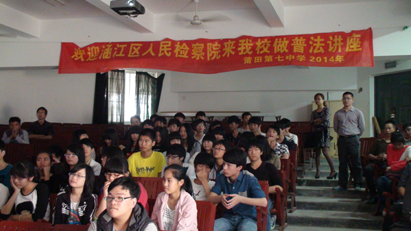 | 涵江区检察院侦查监督科“青少年维权岗”到莆田第七中学(即梧塘中学)开展法制教育活动。活动期间,由干警王文振先给同学们上了一节生动活波的法制教育课,深受同学们的喜爱;课后周素真同志代表检察院向七中图书馆赠送法制讲本“迷失的青春”20本,“青少年维权法宝”100余册,“青少年维权服务卡”及“青年文明号服务卡”200余份,取得良好的社会效果。 七中副校长代表校方深表感谢,并表示该校外来人员及留守学生较多,且学生们正值青春期,火热而燥动,希望我们能够以更多更精彩的形式传授学生们法律知识,好让他们做知法守法的好少年。