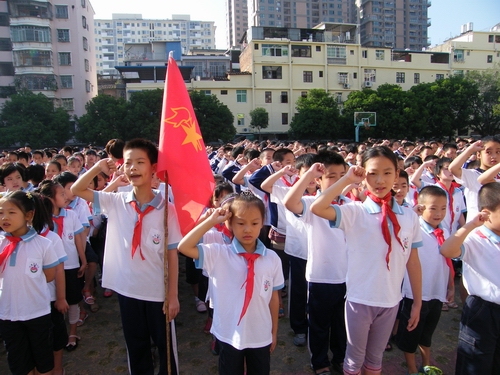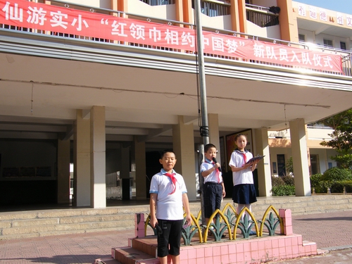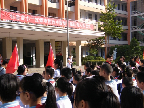 | 为庆祝第65个少先队建队日,引导少先队员们继承和发扬少先队的光荣传统,增强广大少先队员对少先队组织的光荣感和责任意识。10月13日上午,仙游实验小学在操场上举行了隆重的“红领巾相约中国梦”新队员入队仪式,489名新队员带上了鲜艳的红领巾,光荣地加入了中国少年先锋队组织。 入队仪式在出旗曲中拉开序幕,鲜红的队旗迎风飘扬,嘹亮的少年先锋队队歌响彻四方。队旗下高年级的老队员为新队员们戴上了鲜艳的红领巾,队员们的宣誓无比激昂,个个握紧拳头,坚定爱国信念,争当优秀少先队员。二年级的新队员代表谈了入队感言,表示要自觉遵守小学生日常行为规范,要怀着一颗感恩的心对待学习和生活,珍惜荣誉,为胸前的红领巾增光添彩。