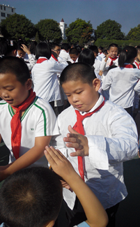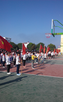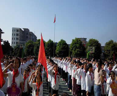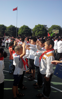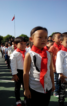 | 火红的队旗高高飘扬,星星火炬闪耀着金光。在这火红的金秋十月,白塘中心小学全体的少先队员们迎来了自己的节日——中国少年先锋队65周年建队日。为了庆祝少先队建队日这一特殊的日子,同时引导广大少先队员继承和发扬少先队的光荣传统,增强少先队员的光荣感和责任感,白塘中心小学在10月13日上午举行了少先队建队日暨一年级新生入队仪式。 经过校少先队大队部批准,白塘中心小学一年级的新生共225名,在庄严的入队仪式上都戴上了崭新的红领巾,在鲜艳的队旗下宣誓,成为了一名光荣的少先队员。当鲜艳的红领巾佩带在他们的胸前时,新队员的脸上都洋溢着激动与自豪。全体队员排着整齐的队列,以饱满的精神迎接这一庄严的时刻,嘹亮的中国少年先锋队队歌在操场上萦绕。 活动最后,在少先队大队辅导员的带领下,全体少先队员在鲜艳的队旗下庄严呼号:“时刻准备着!”——这句铿锵嘹亮的誓言,表达了全体少先队员对未来无限的憧憬和坚定的信念。