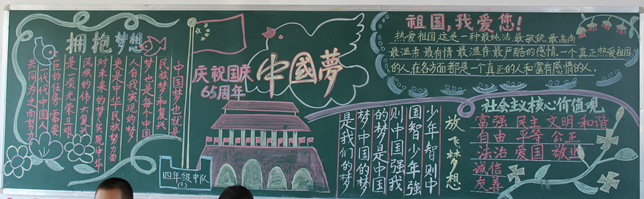 金秋送爽,丹桂飘香。为了庆祝祖国65岁生日,营造一个浓厚的节日氛围,我校开展了以“喜迎国庆 共筑中国梦”为主题的“迎国庆”黑板报评比活动。
