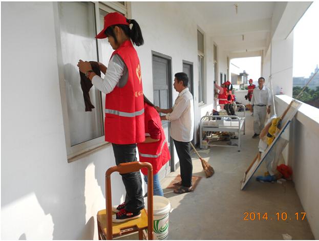 志愿者们到敬老院,为老人们送上慰问品;老人们高兴得像过节似的。接着志愿者们在带队老师的指导下,认真打扫敬老院大楼的楼道卫生、擦洗所有的门窗和楼道栏杆。在大伙儿的共同努力下,院内的卫生面貌焕然一新。最后,志愿者们与老人们进行闲聊,详细了解老人们的生活情况。老人们也鼓励同学们把握大好时光,努力学习,将来做一个对社会有益的人才。
