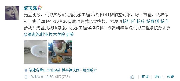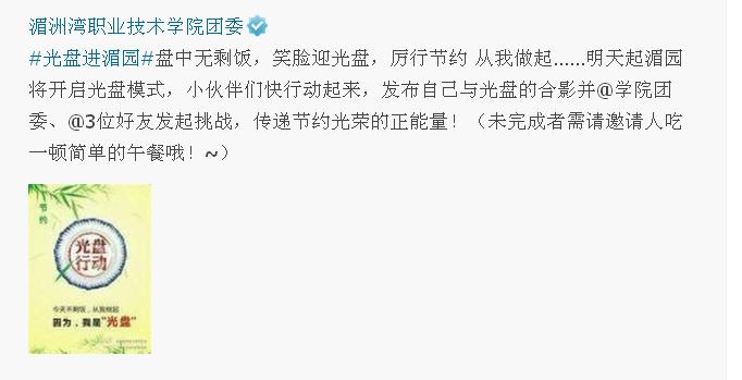 这场本意为呼吁杜绝浪费粮食现象的公益活动,自10月10日传入各大高校,仅用了一周时间,便盘踞微博热门话题榜。湄职院团委也积极开展了这个活动。与冰桶挑战的规则相似,要求被邀请者要在24小时内接受挑战,发布自己与光盘的合影,并且@三名同学继续挑战,同时@湄职院团委,即可参加活动,继续传递节约光荣的正能量。此次活动经学院团委新浪微博、腾讯官方微博发出,就吸引了众多学生参与,大部分受邀的同学都欣然接招,以各种方式上演“光盘达人秀”。